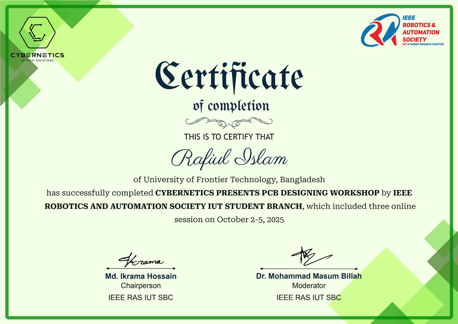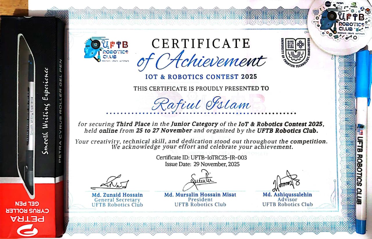 I am Md. Rafiul Islam, an IoT and Robotics Engineering undergraduate at the University of Frontier Technology, Bangladesh. I have hands-on experience in robotics, embedded systems, software development, Tech blogger and AI-driven automation.